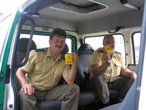 ![]() Polizeibeamte aus Cottbus freuen sich über eine Tüte Original-Schutzbär-Bulli-Gummibärchen. |
