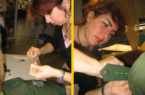 Wirges näht die neuen Schulterklappen an Bullis Uniform.