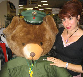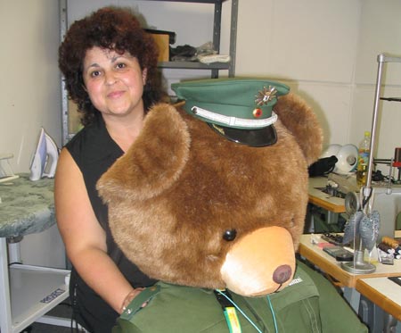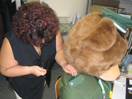 näht die neuen Schulterklappen mit 3 Sternen an Bullis Uniform.