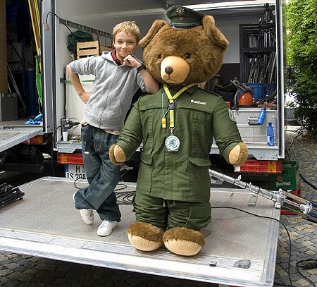 | August 2006 Bulli trifft Manuel Steitz, einen der Hauptdarsteller aus "Herr Bello", Kinofilm von Collina Filmproduktion GmbH ![]() Fotos: Frank Hügle, Karlsruhe "Cool, dass es euch gibt! Ich hab zwar von der Aktion "Schutzbär Bulli" vorher noch nie gehört, aber jetzt finde ich es gut zu wissen, wohin man sich wenden kann. Auch wenn ich hoffe, dass ich euch nie brauchen werde. Ich wünsche euch mit eurer Aktion weiterhin viel Erfolg!" Euer